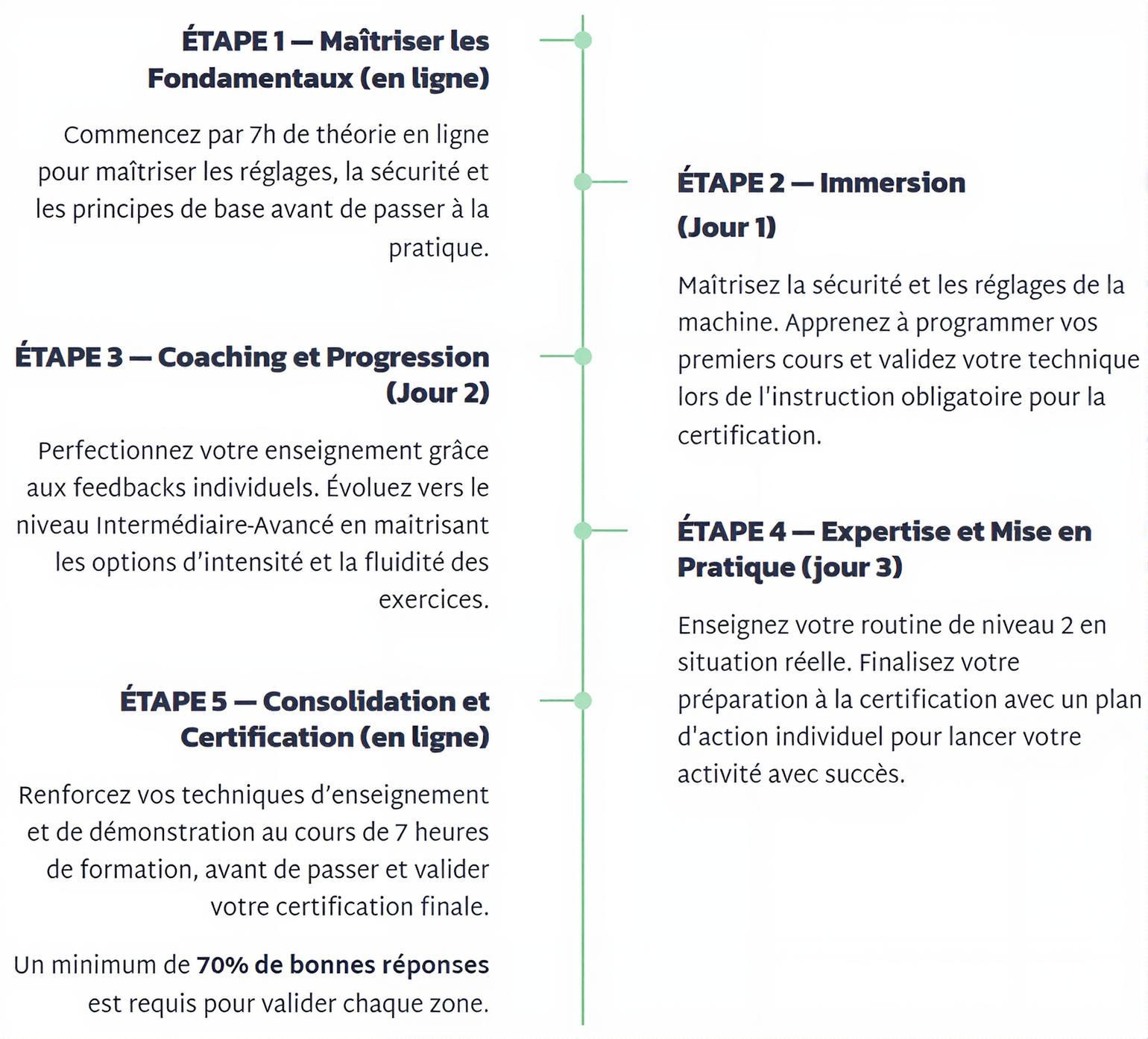 Nous conseillons d’avoir accès à un Reformer (idéalement un modèle Aura Pilates pour une fluidité optimale) dès la moitié du cursus afin de mettre en application immédiate les modules de biomécanique et d’enchaînement.