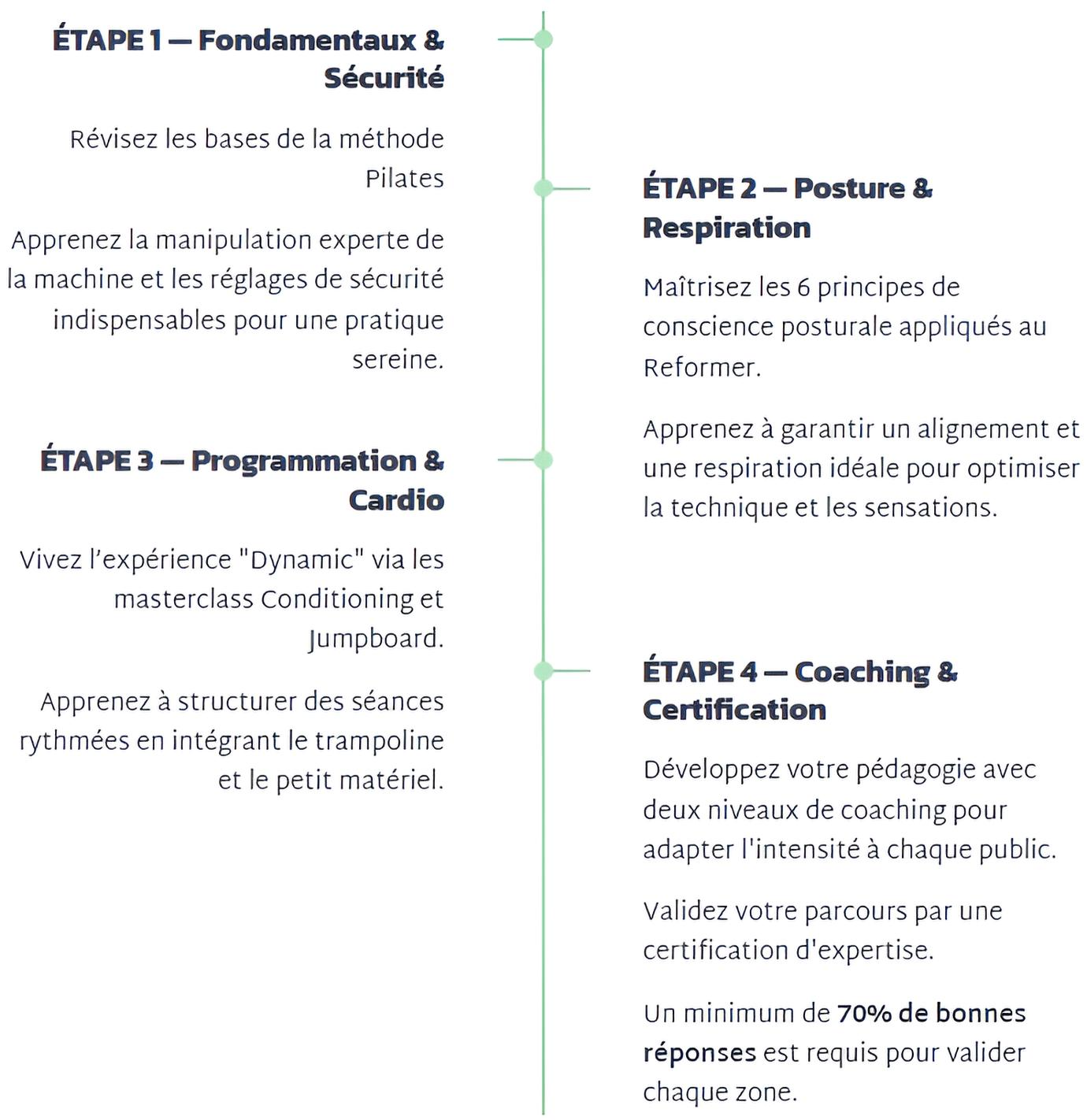Commencez par le [Starter Kit] Les Bases du Reformer. C’est une immersion indispensable pour comprendre la mécanique de la machine, la gestion des ressorts et la sécurité avant d’apprendre à enseigner.