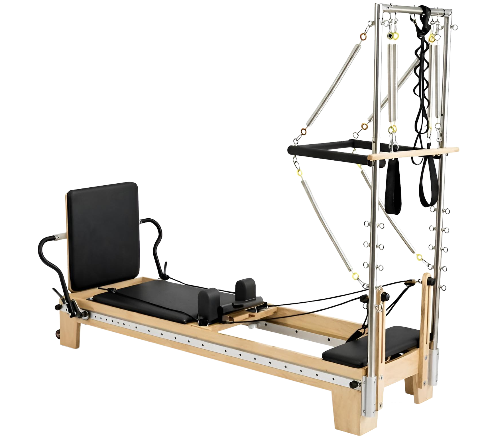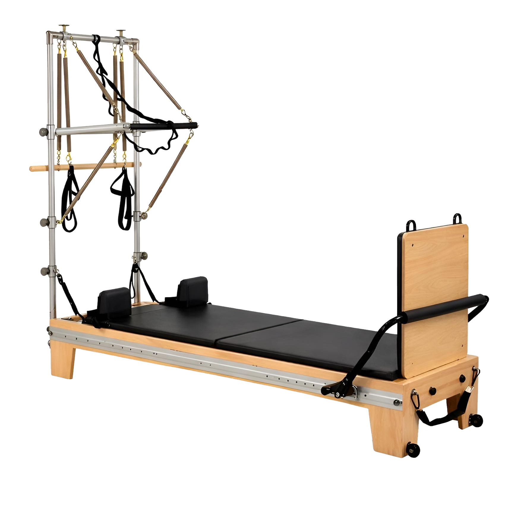 Le reformer tour conserve toutes les fonctions d’un reformer classique, tout en ajoutant les possibilités offertes par le travail vertical et assisté.